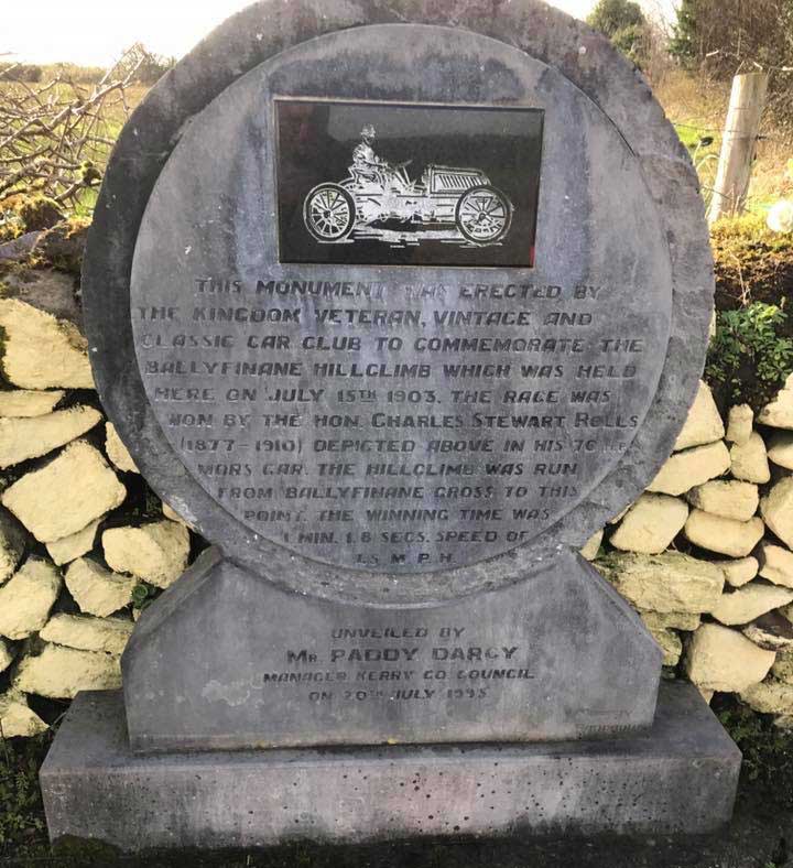 In 1993, the Kerry Vintage and Veteran Car Club held a hill climb in Ballyfinnane to mark the very important historic race that took place in 1903. A commemoration plaque was also erected in 1993 at the top of the hill climb in Ballyfinnane,in honour of the very important milestone in the Irish Motor Sport Industry.